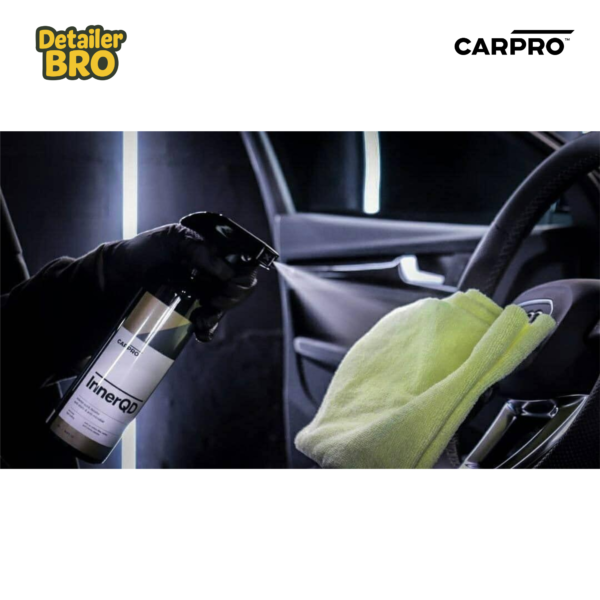 Announced during SEMA week of 2021, CARPRO InnerQD is a quick and easy to use, antistatic and antimicrobial interior detailing spray! InnerQD can be used throughout the cockpit on nearly any surface to easily remove fingerprints, dust and light soiling. Not only is it super easy to use but CARPRO InnerQD also inhibits the electrostatic adhesion of dust particles.